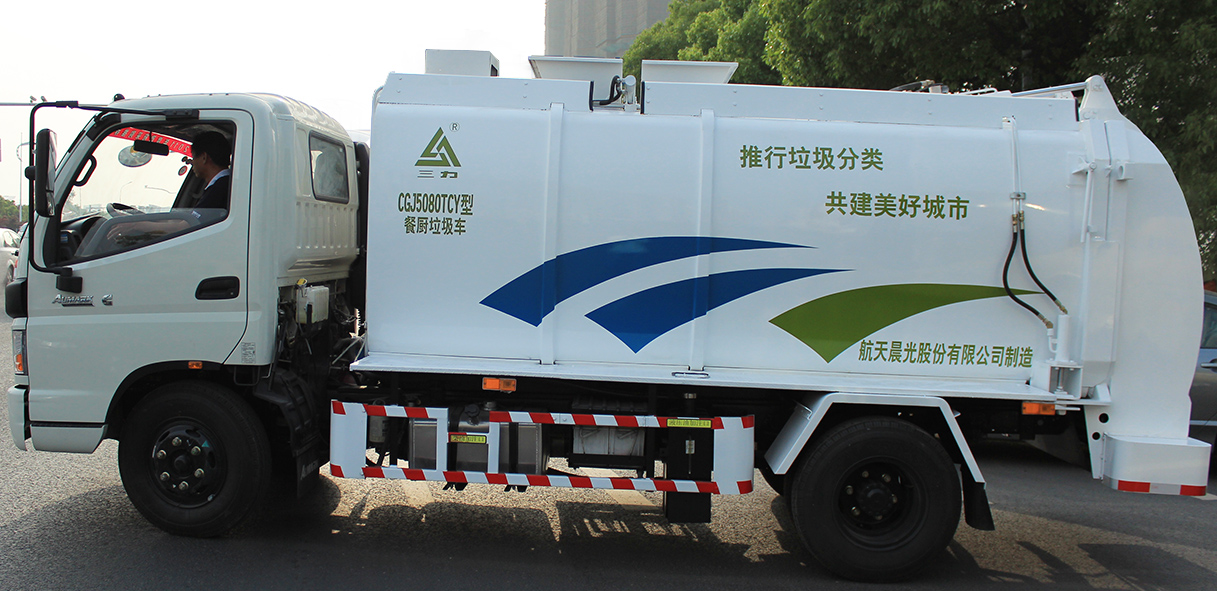 CGJ5080TCAE5/CGJ5080TCY型餐廚垃圾車是對賓館、餐廳、食堂的廚余垃圾、食品加工的廢料、副食品集貿市場和超市的過期商品等直接收運的專用車輛。該產品通過底盤取力器驅動液壓泵,產生高壓油,帶動液壓系統工作,從而提桶機構和頂蓋工作,將垃圾桶內垃圾倒入箱體;到指定地點,打開后門,推出推板進行卸料,完成作業。